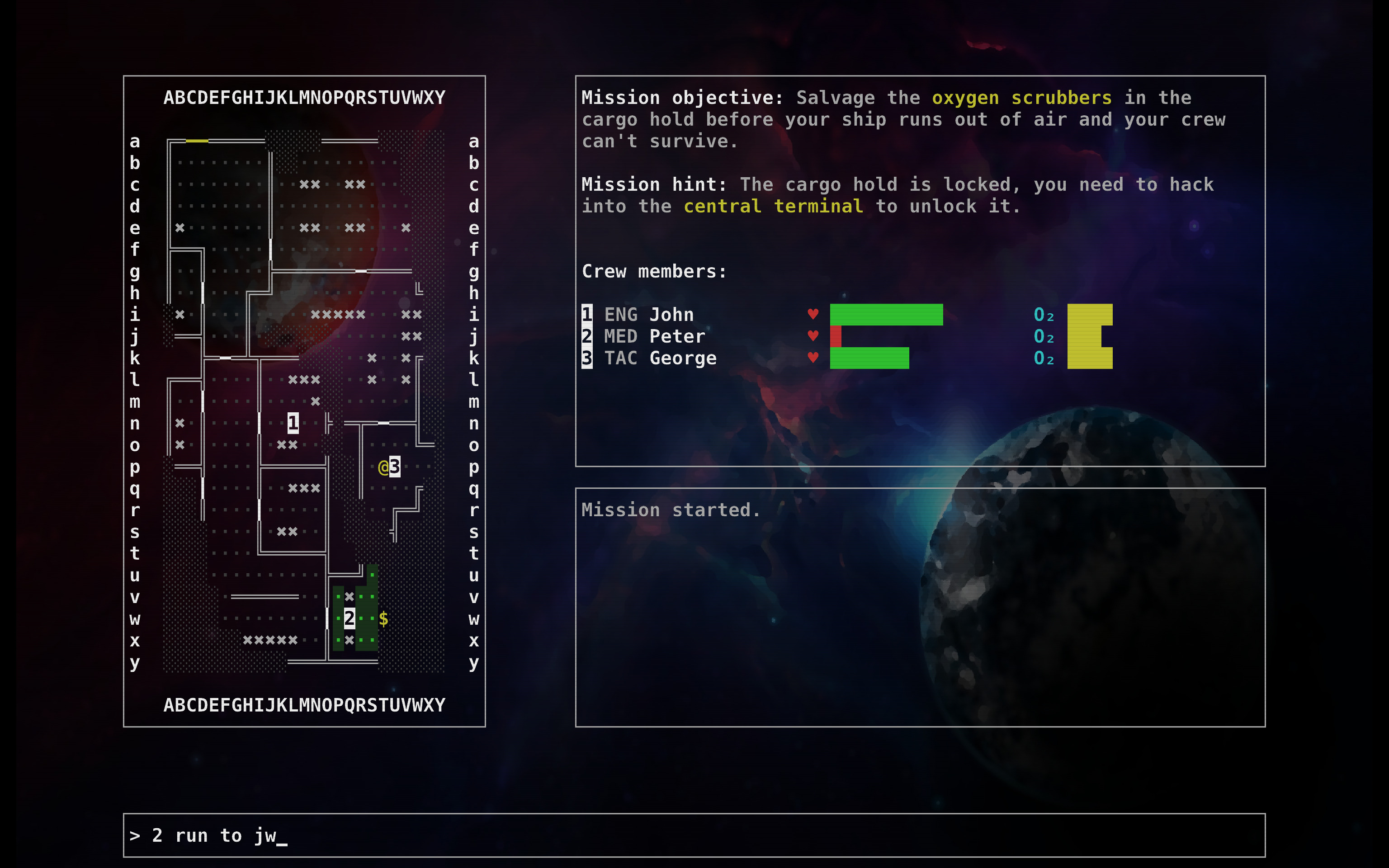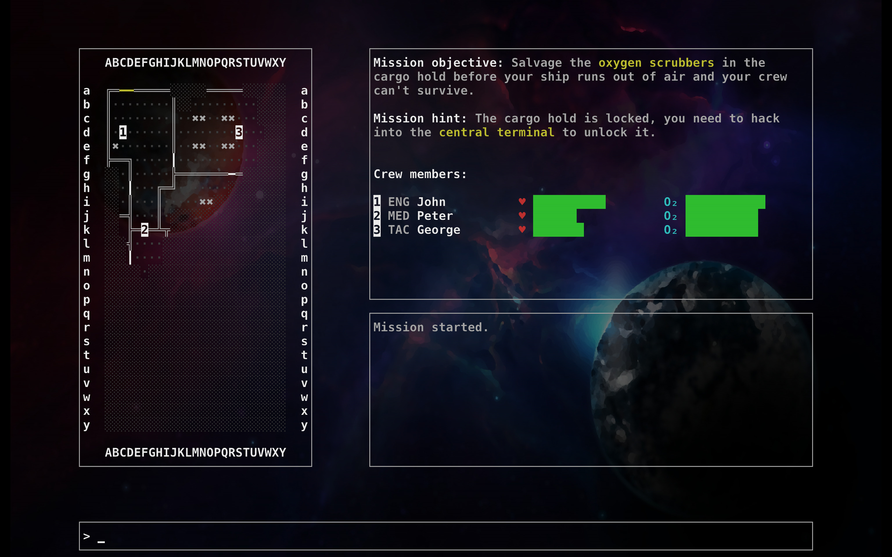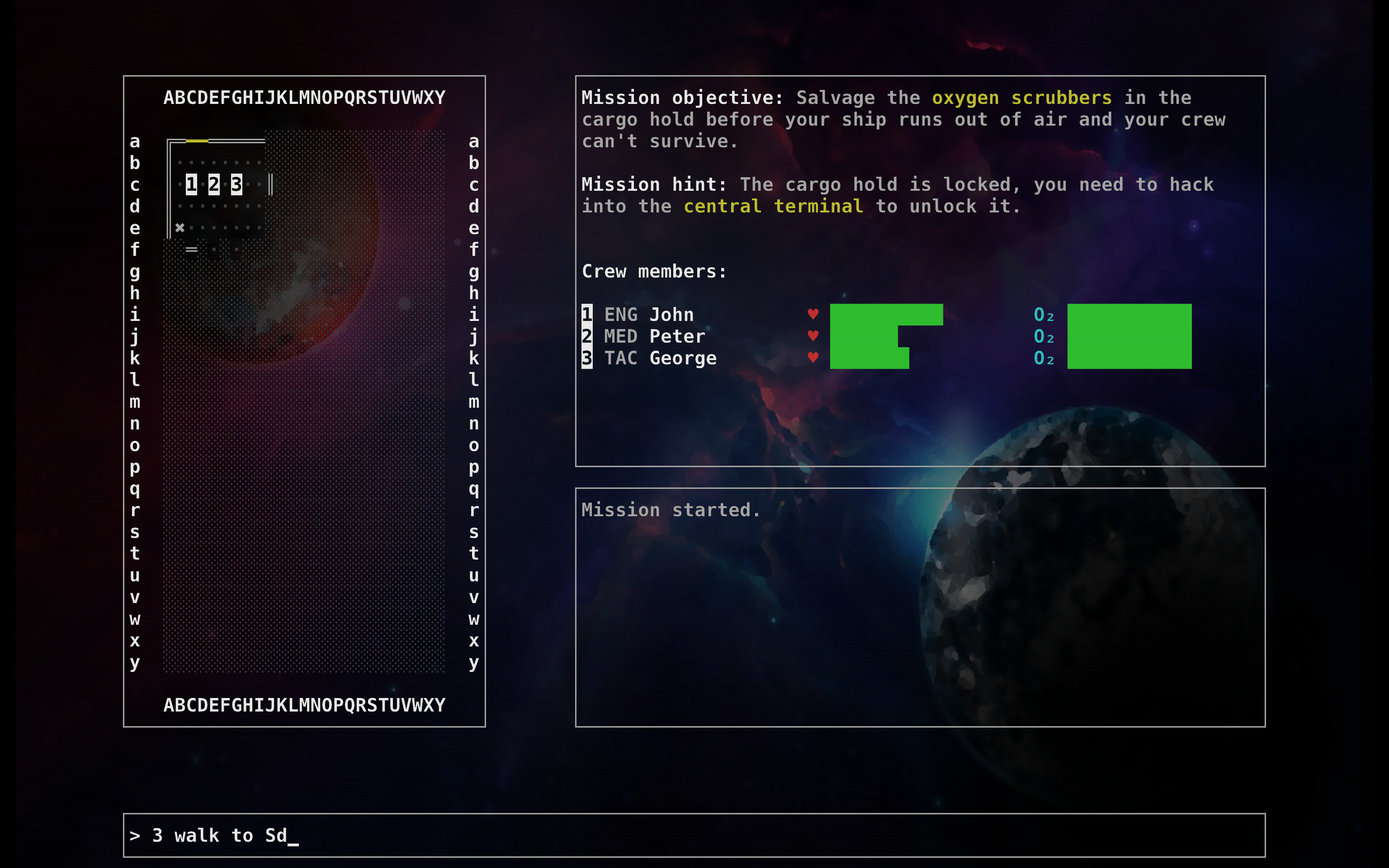 You're a salvage captain. Your crew scavenges derelict wrecks in a post Earth universe. Every mission is timed, oxygen depletes, radiation kills, and you type commands in real-time to execute the missions and keep your people alive.